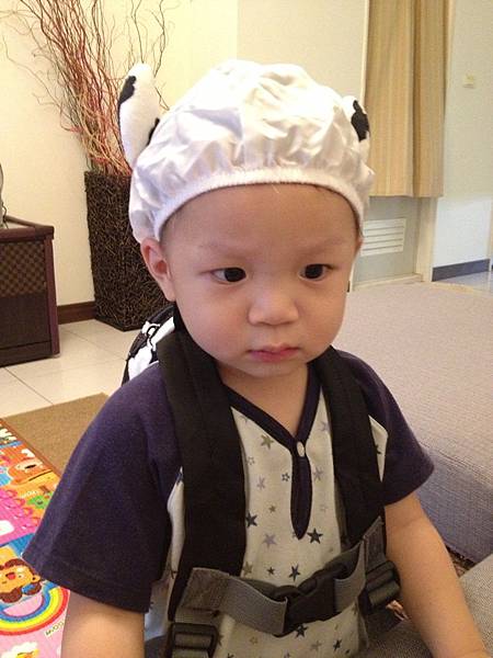 然後有點無助 (因為媽媽太開心,不想幫忙把雨帽拿下來)