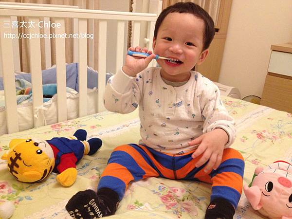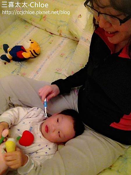 希望可以進步到媽媽喊 : 刷牙了,嬰童就會自己跑來媽媽大腿上躺著
