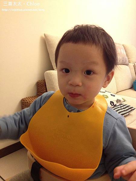 因為離脖子太近,每次戴上去,他就會一直去扯圍兜