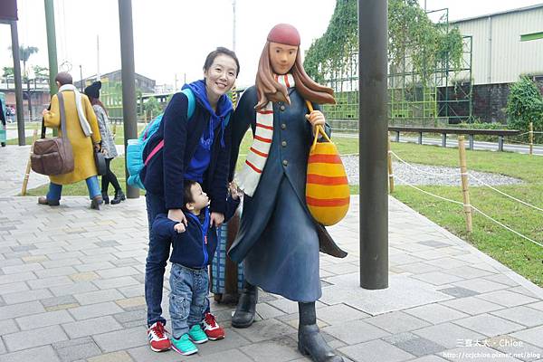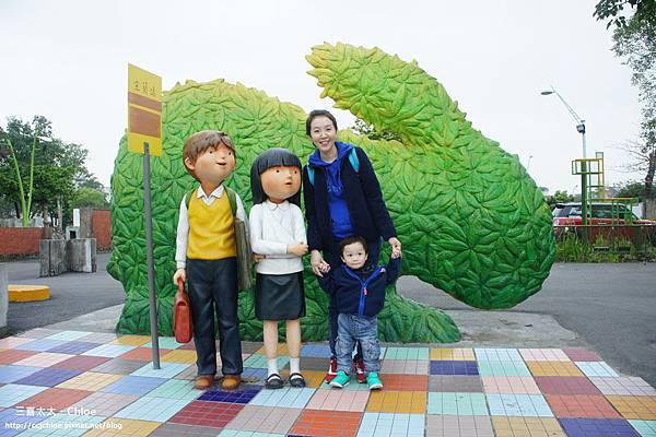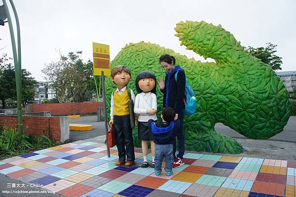 兩尊大型學生人偶,站在站牌前等車的模樣,這個好有fu喔