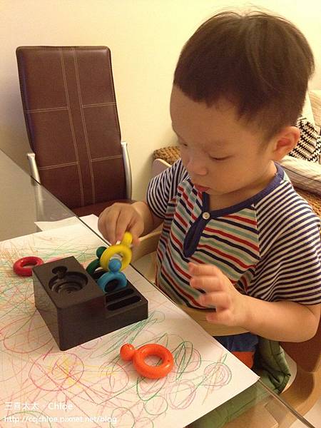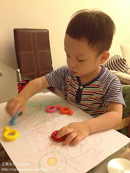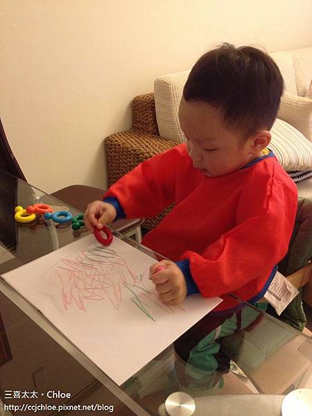 這天又拿出蠟筆教他畫圓形,這小子居然可以依樣畫葫蘆地畫出個圓耶!