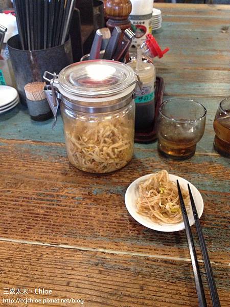 桌上的涼拌豆芽菜是店家免費提供的小菜
