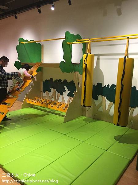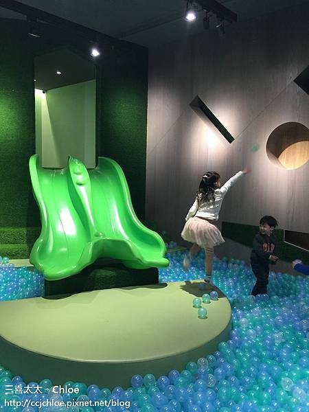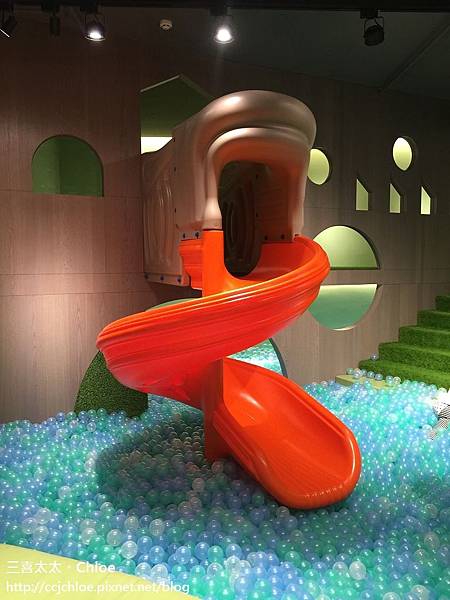 藍綠色半透明的球池讓人好像身處海洋裡, 牆壁、樓梯都舖上綠色假草皮,又彷彿像是進入森林。