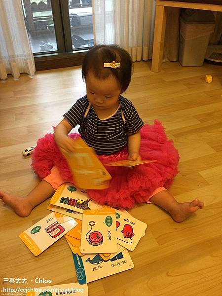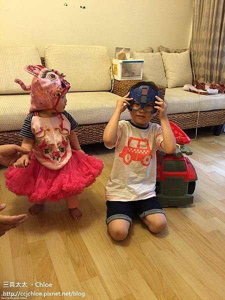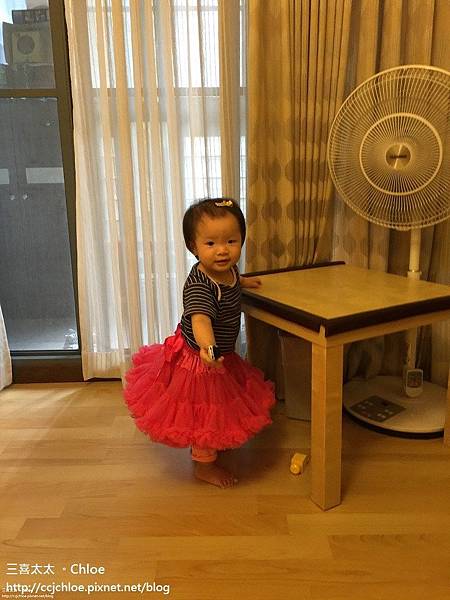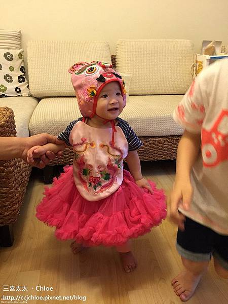 趁著客人還沒來,先讓嬰兒試穿一下抓周服, 嬰兒穿上澎裙好像洋娃娃喔, 生女兒等的不就是這個嗎,可以幫她打扮,嘻