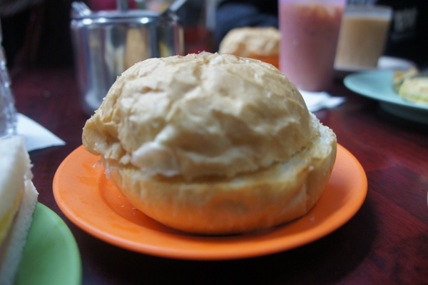 類似法國麵包, 但質地較軟, 不會硬硬的, 咬起來很有嚼勁, 裡面夾著牛油,
